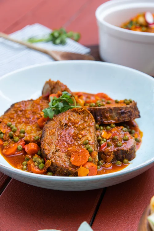A plate of braised beef with vegetables