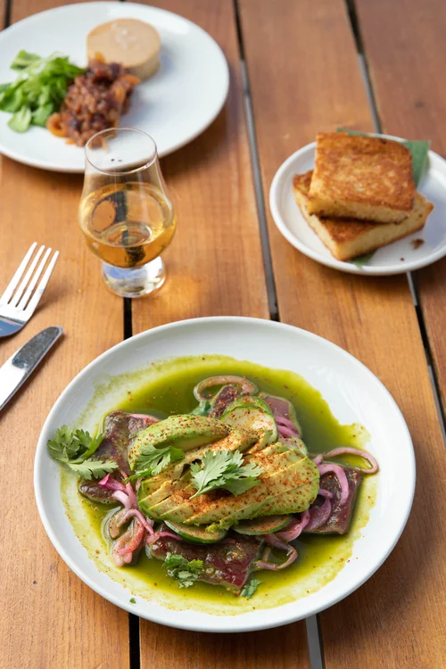 An avocado salad served with a green sauce. Amara at paraiso.