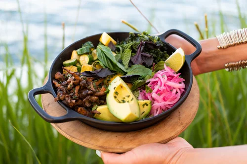 A breakfast bowl served in a cast iron pan.