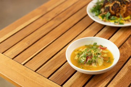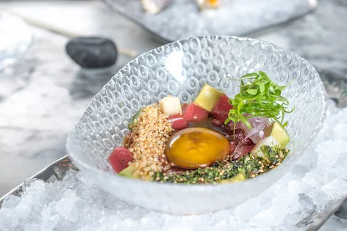 Yellow pepper ceviche served on a plate. Amara at Paraiso.