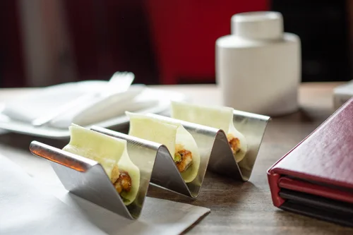 Sliced cucumber tacos on a plate at Bazaar by Jose Andres.
