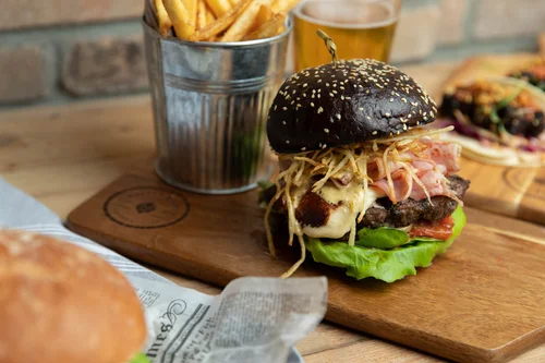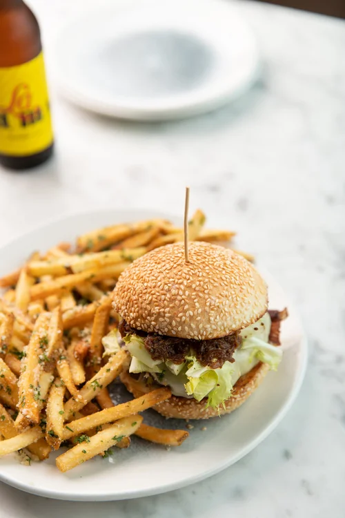 A sesame bun burger with fries on a plate at Traymore.