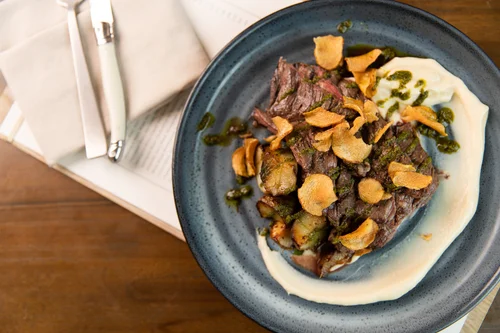 Grilled steak topped with crispy potato slices.