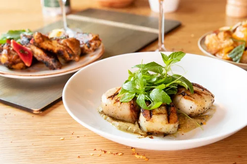 Pan-seared scallops with creamy white sauce on a plate at Bazaar by Jose Andres.