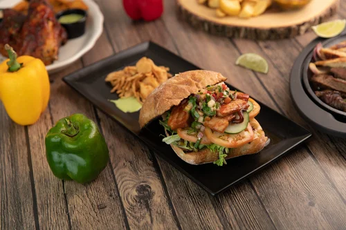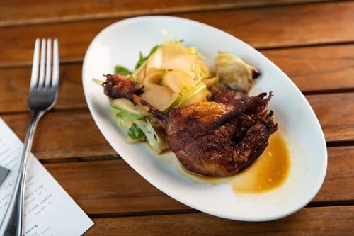 Roasted chicken served with baby corn and roasted peppers. Amara at Paraiso.
