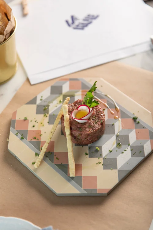 Fish tartare with micro greens on a plate at Bazaar by Jose Andres.