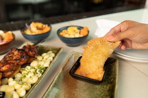 Fried empanadas with white truffle served on a plate. Amara at Paraiso.