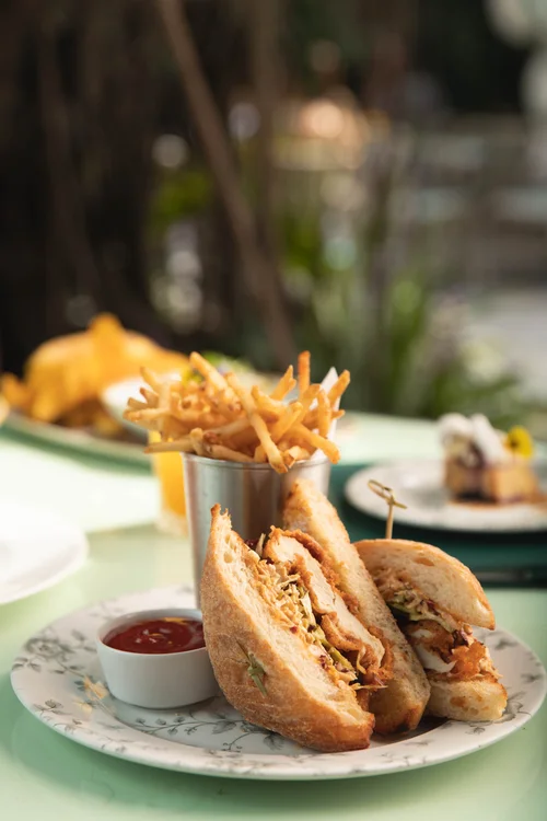 A turkey and tomato sandwich served with fries. Amara at Paraiso.