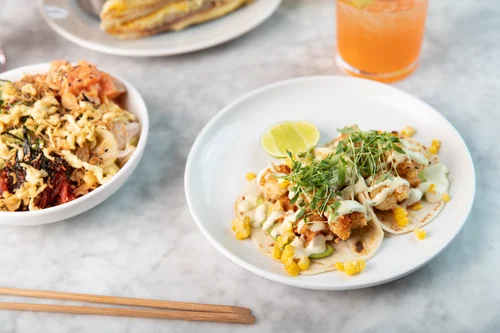 Kimchee avocado toast on a plate at Traymore.