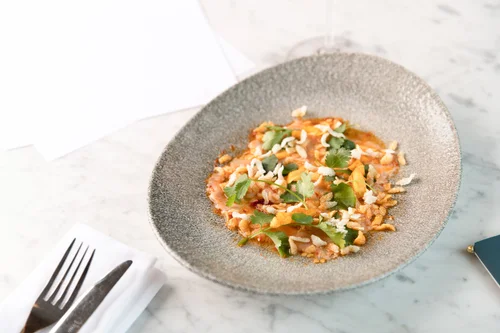 Ceviche garnished with crispy rice on a plate at Traymore.
