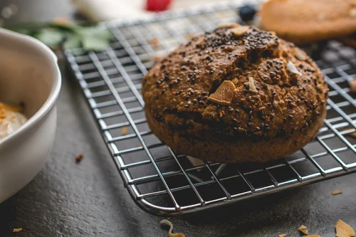 A blueberry muffin being spread open